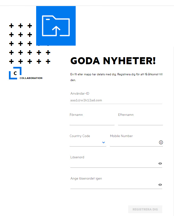 När en fil delas med en extern användare måste användaren logga in på Filr-programmet för att komma åt filen. När filen delas skickas ett e-postmeddelande till den externa användaren med länken till ett självregistreringsformulär. Användaren måste registrera detaljerna i formuläret och slutföra självregistreringsprocessen för att kunna logga in till Filr-programmet. Formuläret ser ut så här: