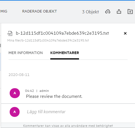 Hämta filen – användaren kan hämta filen eller mappen. De mediefiler som webbläsaren har stöd för renderas direkt i webbläsaren. Sedan kan du hämta filen. Om webbläsaren saknar stöd för filtypen hämtas filen automatiskt. PDF-filer som är större än 32 MB hämtas automatiskt. Du kan även hämta filer med hjälp av kommandoradsverktyg såsom wget och curl.