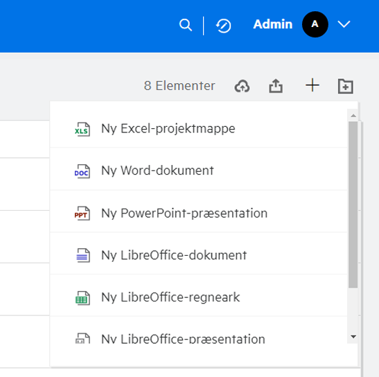 Du kan nu redigere brugerdefinerede skabeloner eller oprette en ny fil i Filr. Indstillingen Opret ny fil er kun tilgængelig til Advanced Filr Edition, og Content Editor skal være aktiveret af administratoren. Du finder denne indstilling på rodniveau og mappeniveau i områderne Mine filer og Netmapper. I området Delt med mig og Delt af mig finder du kun denne indstilling på mappeniveau.