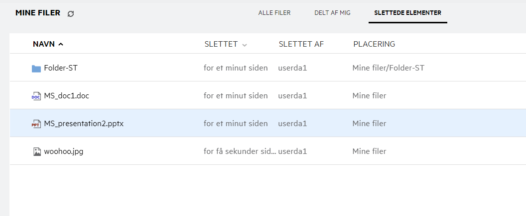 Angiver de filer eller mapper, som du har slettet. I Filr er det muligt at hente filer og mapper fra papirkurven og gendanne dem på deres tidligere lokation. Når du gendanner en fil, gendannes alle tilknyttede kommentarer også.