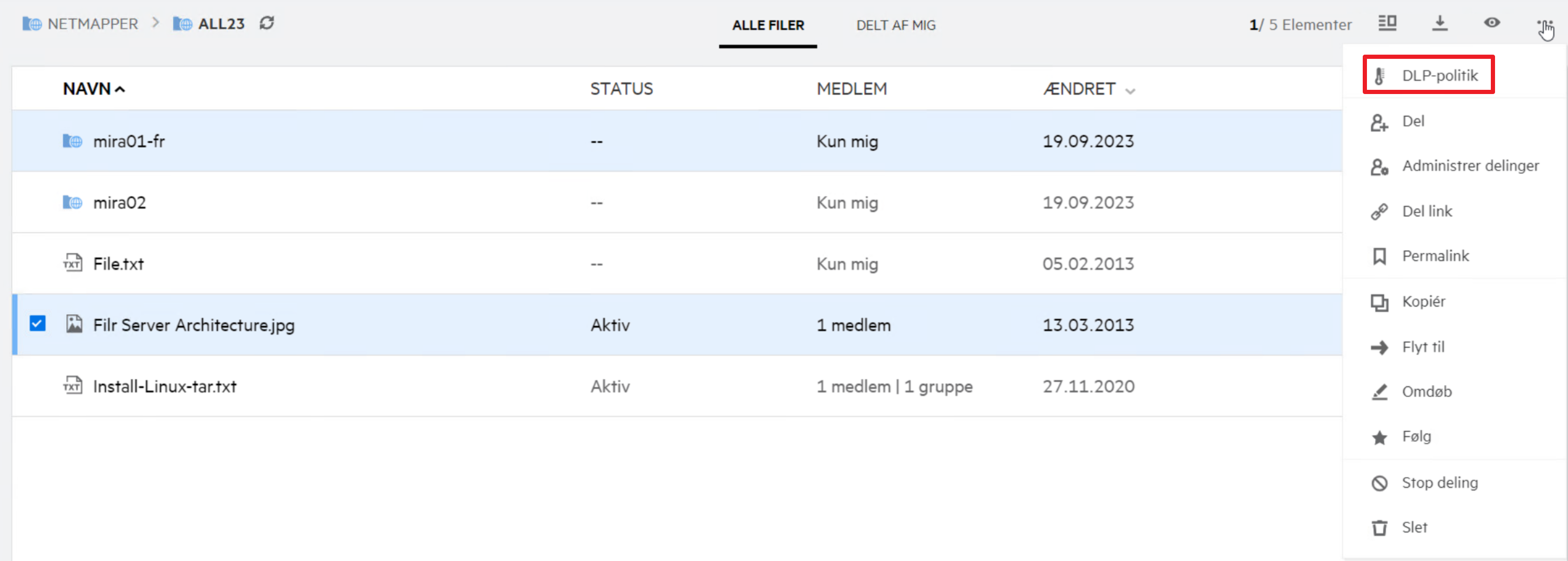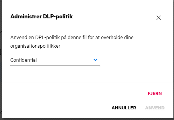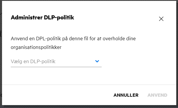 Hvis DLP er aktiveret, og der ikke anvendes en politik på netmappeniveauet, vises knappen DLP-politik over fanen Detaljer. Du kan klikke på denne knap, vælge en politik og anvende den på filen.
