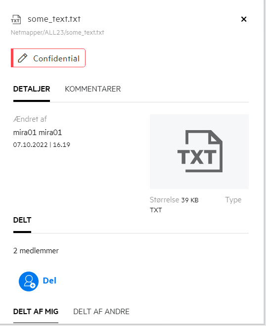 Member (Medlem): Medlem af filen eller mappen. Antallet af brugere eller grupper, hvis filen eller mappen er delt.