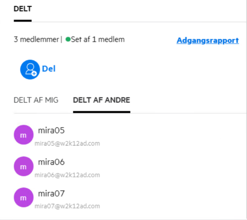 Shared By (Delt af): De brugere, der har delt elementet med dig. Hvis mere end én bruger har delt et bestemt element med dig, vises hver enkelt bruger.