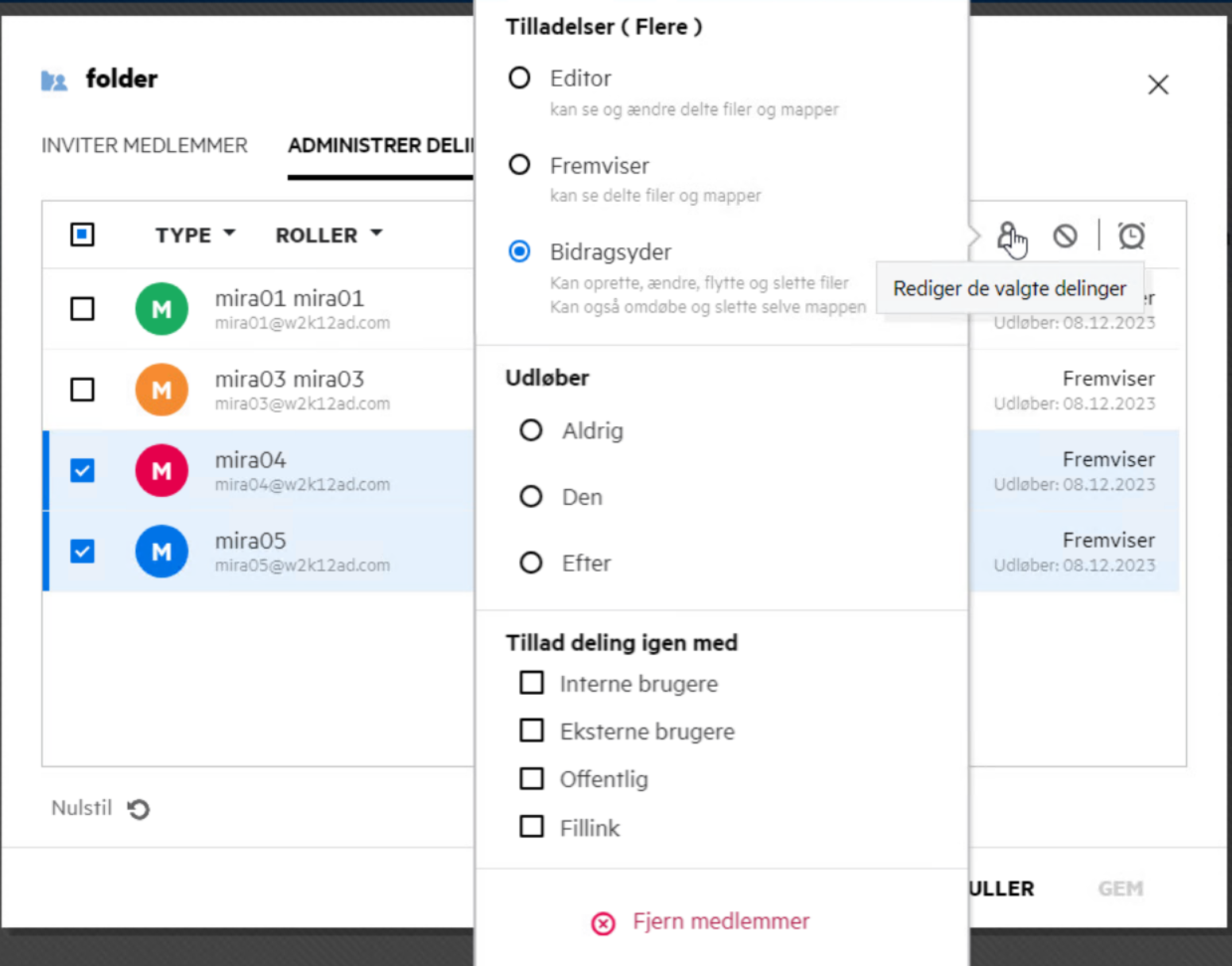 Her kan du ændre delingstilladelserne og udløb for deling. Hvis du klikker på indstillingen Nulstil, nulstilles de ændringer, der er foretaget af de gamle tilladelsesindstillinger.