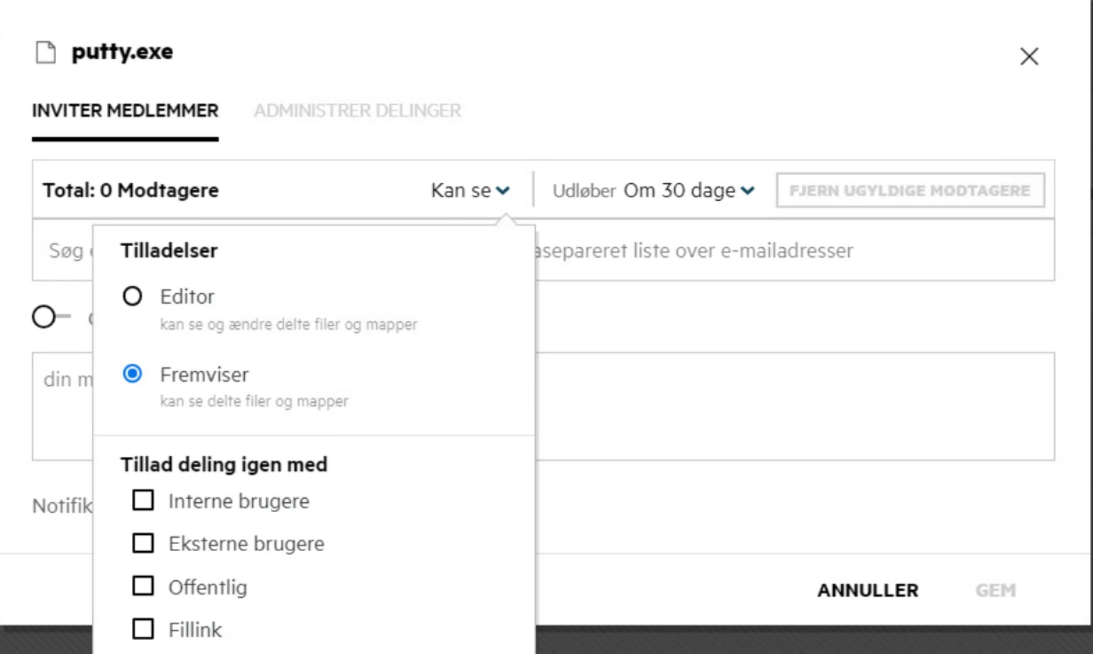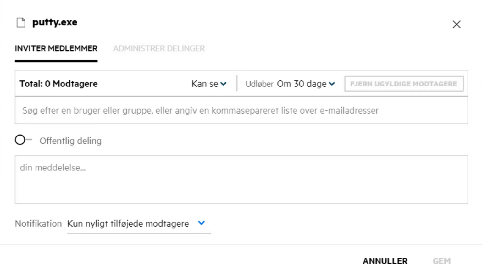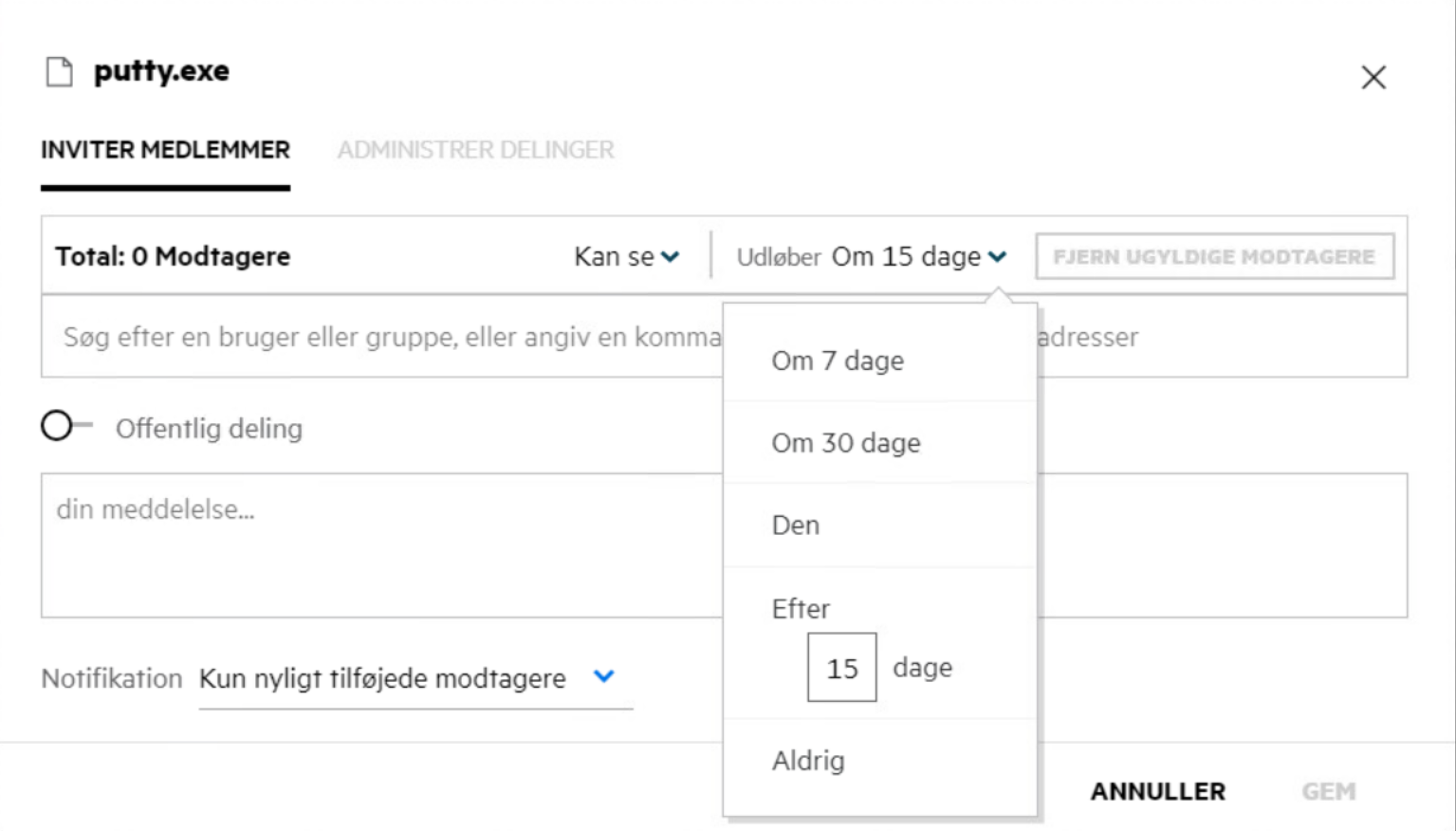 Aldrig - Denne indstilling er kun tilgængelig, hvis Tillad, at delinger aldrig udløber er aktiveret i administrationskonsollen. Hvis den deaktiveres, er de eksisterende delinger, der blev delt med indstillingen Aldrig, fortsat i en tilstand, hvor de aldrig udløber.