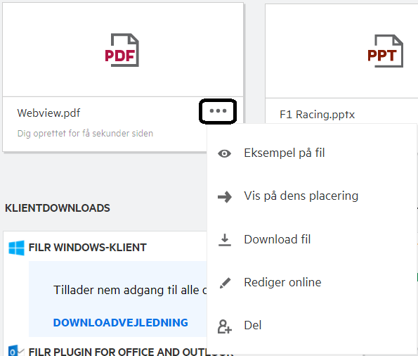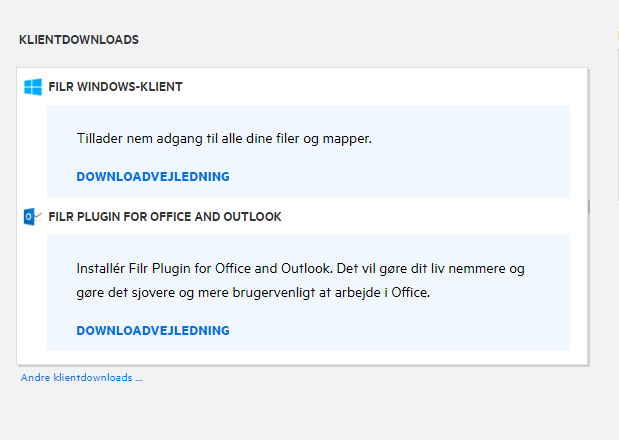 CLIENT DOWNLOADS (KLIENTOVERFØRSLER): Oplysninger om Filr-standardklienten, links til overførsel til andre Filr-klienter samt plugins til Office og Outlook.
