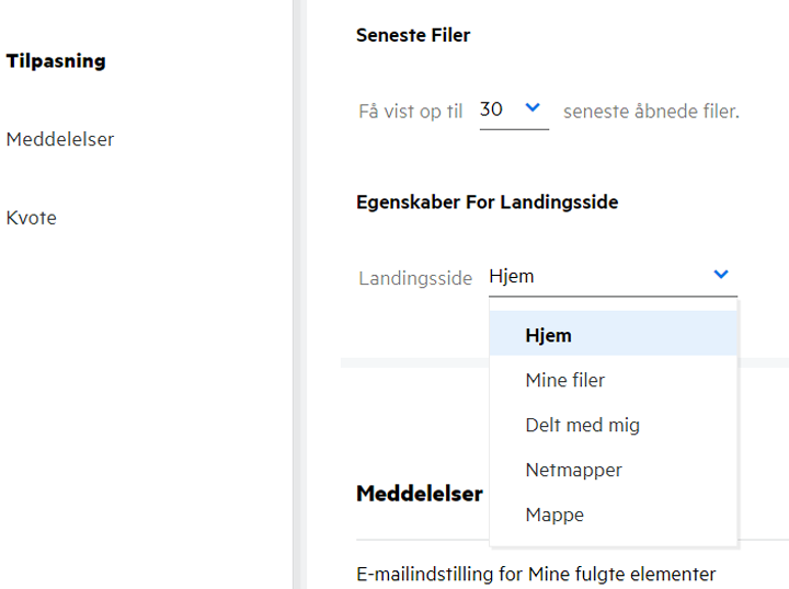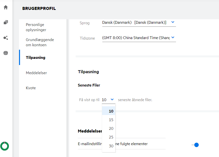 Antallet af filer, der skal vises på listen Seneste filer, kan konfigureres. Hvis du vil konfigurere indstillingerne, skal du navigere til din brugerprofil.
