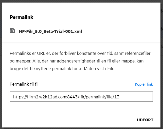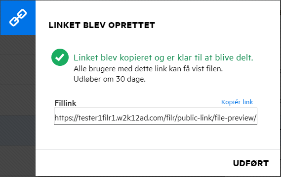 Du kan nu dele linket direkte med andre via e-mail, sms, sociale medier eller et andet samarbejdsforum. En bruger, der klikker på linket, får direkte adgang til filen. Afhængigt af typen af link kan brugere se eller downloade filen.