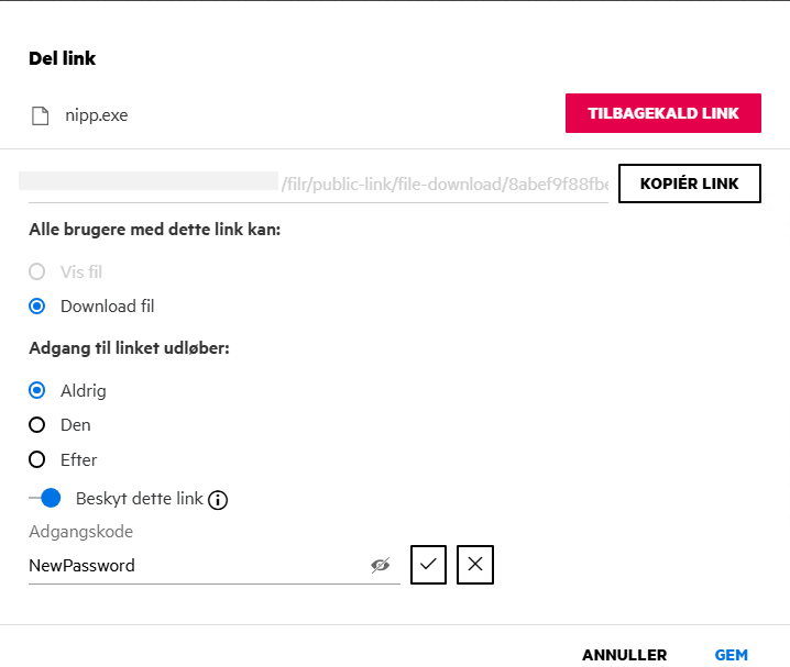 Her kan adgangskoden ændres, og det link, der allerede er oprettet, forbliver uændret. Hvis du vil hente et nyt link, skal du klikke på Tilbagekald link og følge de trin, der er angivet i Hvordan oprettes der et delingslink eller et delingslink, der er beskyttet med en adgangskode?