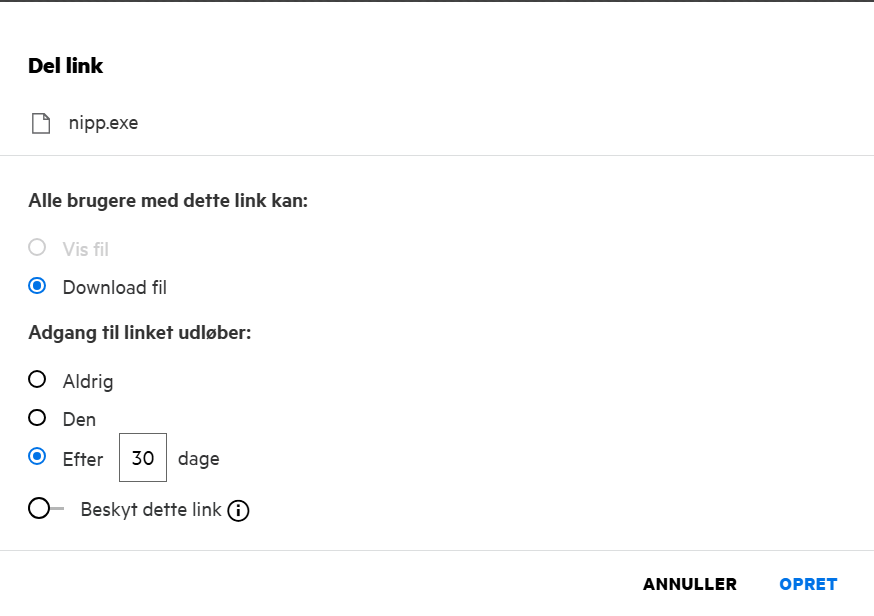 Efter - Indstil udløbsdatoen for delingslinket i forhold til dags dato.