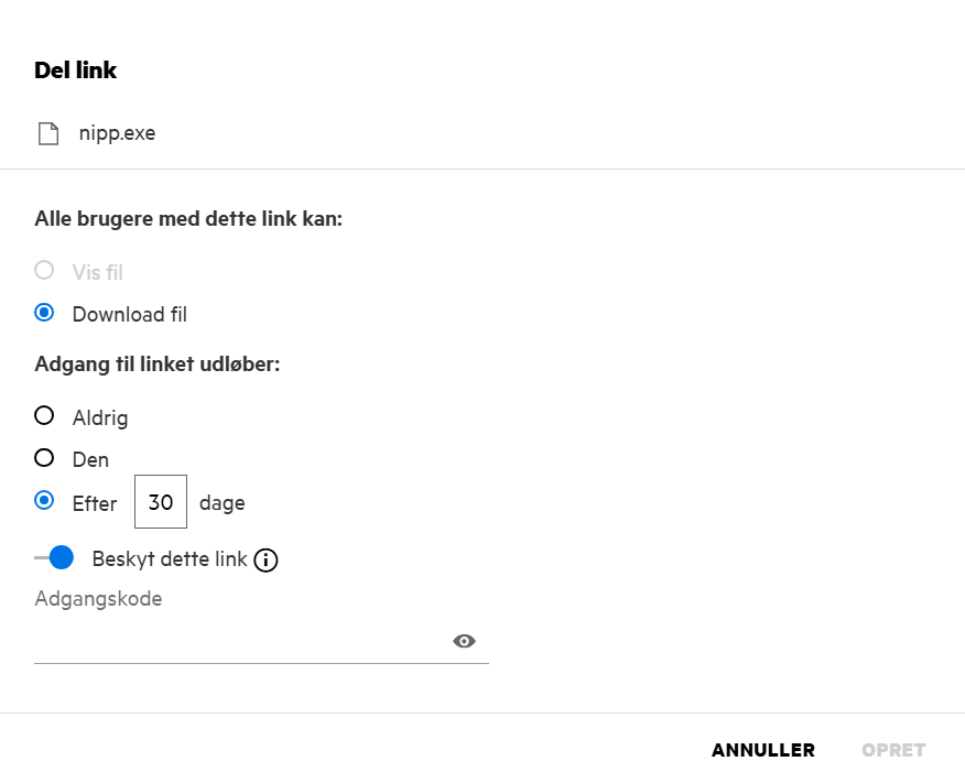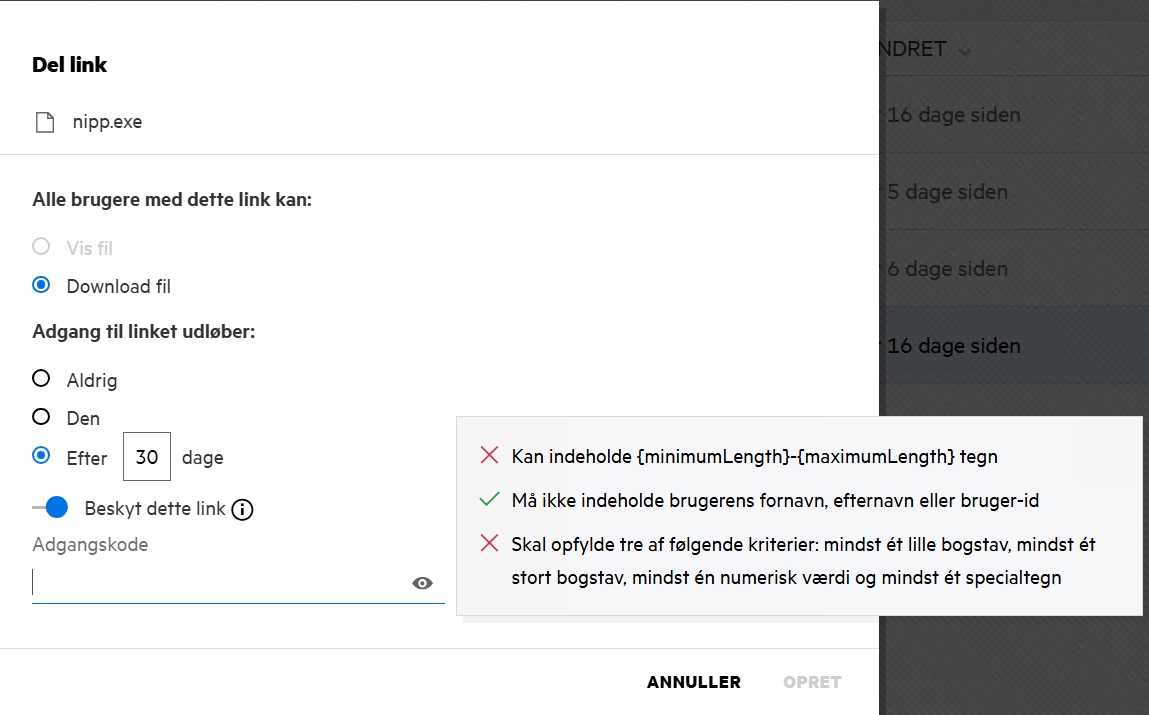 Adgangskode - Angiv adgangskoden til det delingslink, der skal oprettes for filen. Hvis Anvend Filrs adgangskodepolitik, når du indstiller adgangskoder til delingslinks er aktiveret i administratorkonsollen, skal du indstille adgangskoden, så den overholder Filrs adgangskodepolitik.