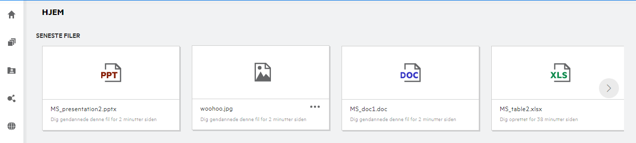 I Seneste filer kan den bruger, der er logget på, se de filer, der senest har været åbnet. Når filen deles, er det kun filejeren og modtageren, der kan se filerne i Seneste filer. Bruger A (ejeren) deler f.eks. en fil med bruger B. Filen vises på listen Seneste filer for bruger A og bruger B. Hvis den samme fil deles af bruger A med bruger C efter et par dage, vises den delte fil på listen Seneste filer for bruger A og bruger C.