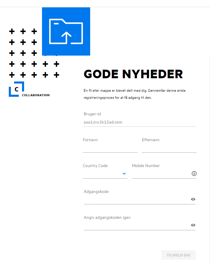 Når en fil deles med en bruger uden for organisationen, skal brugeren logge på Filr-programmet for at få adgang til filen. Når filen deles, sendes der en e-mail til den eksterne bruger med linket til en selvregistreringsformular. Brugeren skal registrere detaljerne i formularen og fuldføre selvregistreringsprocessen for at kunne logge på Filr-programmet. Formularen ligner nedenstående: