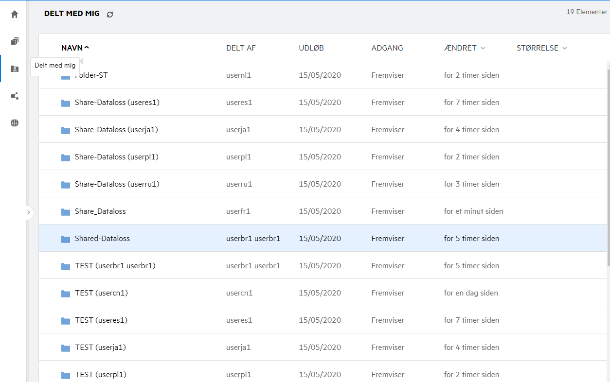 Angiver de filer og mapper, som du har delt med andre brugere. Brug dette område til at administrere de rettigheder, som de andre brugere har til de filer, du har delt med dem. Du kan tilbagekalde rettigheder, tildele yderligere rettigheder osv.