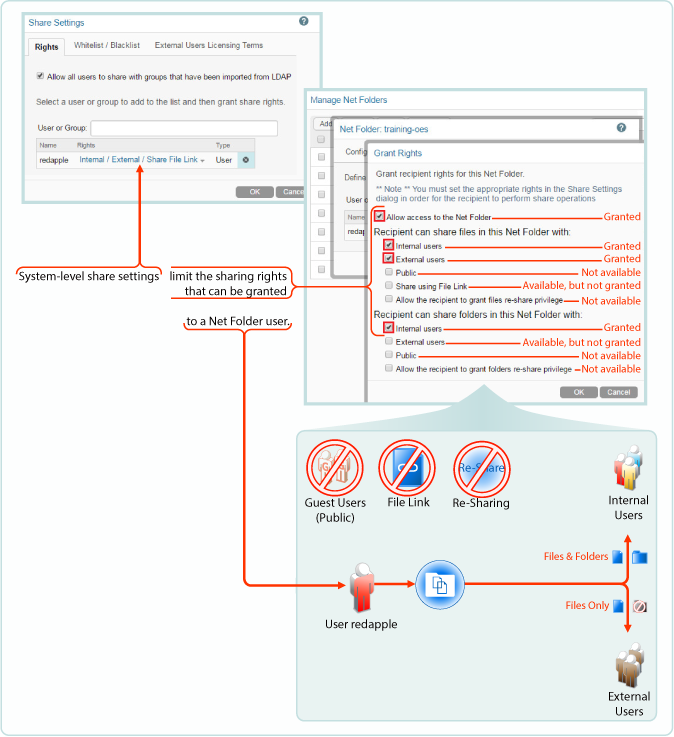 In Figure 13-3, user red can only be assigned sharing rights that are allowed at the system level.