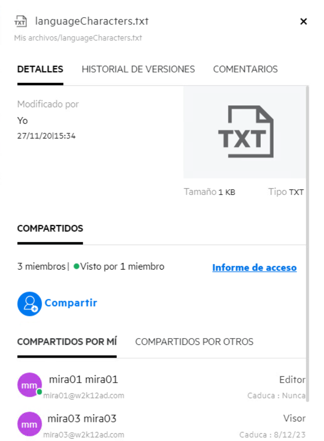 Miembro: el miembro del archivo o la carpeta. Si se ha compartido, el número de usuarios o grupos.