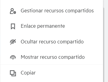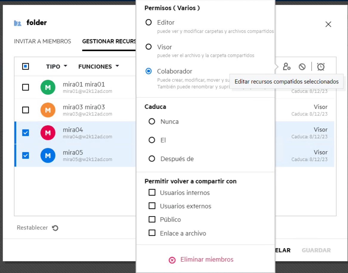 Al compartir varios archivos o carpetas, si un archivo tiene derechos de visualización y una carpeta tiene derechos de colaborador, se tendrán en cuenta los derechos de visualización. Puede editar los permisos de uso compartido mediante la opción Gestionar recursos compartidos del menú Más acciones de un archivo. En el cuadro de diálogo Gestionar recursos compartidos, en Gestionar recursos compartidos, seleccione el nombre de usuario o grupo y, a continuación, haga clic en