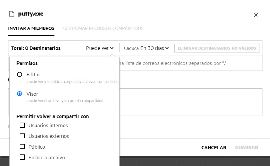 Aquí puede cambiar los permisos de uso compartido y la caducidad del recurso compartido. Al hacer clic en la opción Restablecer, se restablecerán los cambios realizados en la configuración de permisos anterior.