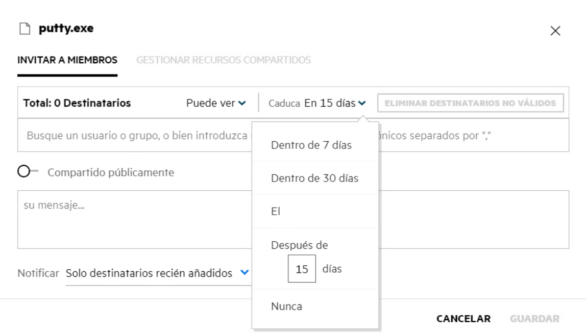 Caducidad: la fecha de caducidad del elemento compartido. Después de esta fecha, ya no tendrá acceso al elemento compartido.