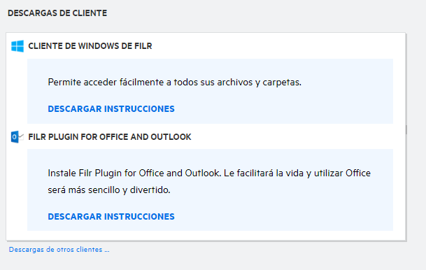 DESCARGAS DE CLIENTE: información acerca del cliente Filr nativo, enlaces de descarga a otros clientes Filr y los plugins de Office y Outlook.