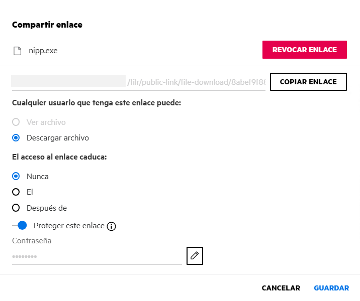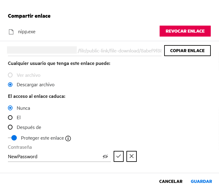En este caso, se modifica la contraseña y el enlace generado sigue siendo el mismo. Si desea obtener un nuevo enlace, haga clic en Revocar enlace y siga los pasos que se indican en ¿Cómo se genera un enlace para compartir normal o uno protegido por contraseña?.