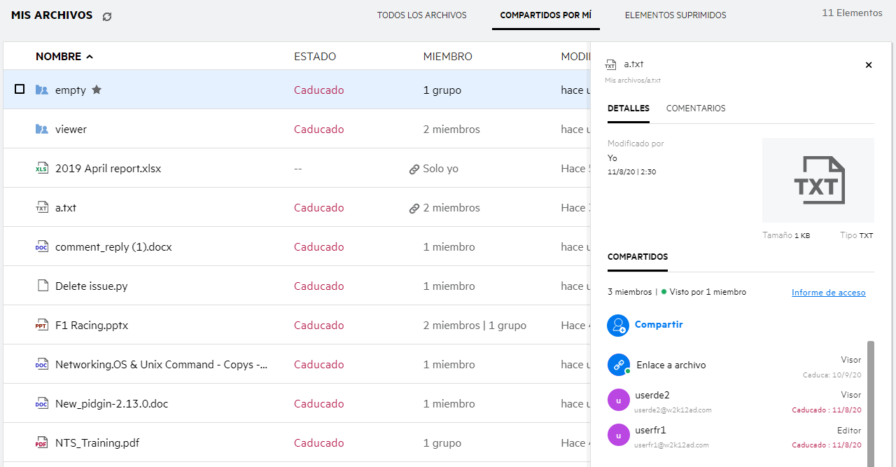 Estado: el estado del archivo o la carpeta: Caducado o Activo.