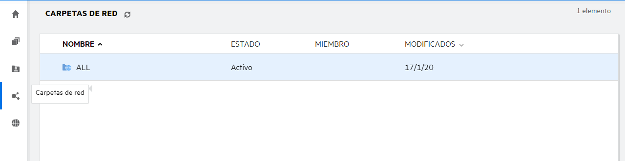 el icono Carpetas de red del panel lateral izquierdo. El área Carpetas de red proporciona acceso al sistema de archivos de su organización. El administrador de Filr determina las carpetas de red que puede ver y los derechos de uso compartido que tiene asignados en cada una de ellas. El área Carpetas de red no estará disponible en el panel de la izquierda si el administrador de Filr no ha asignado ninguna carpeta de red.