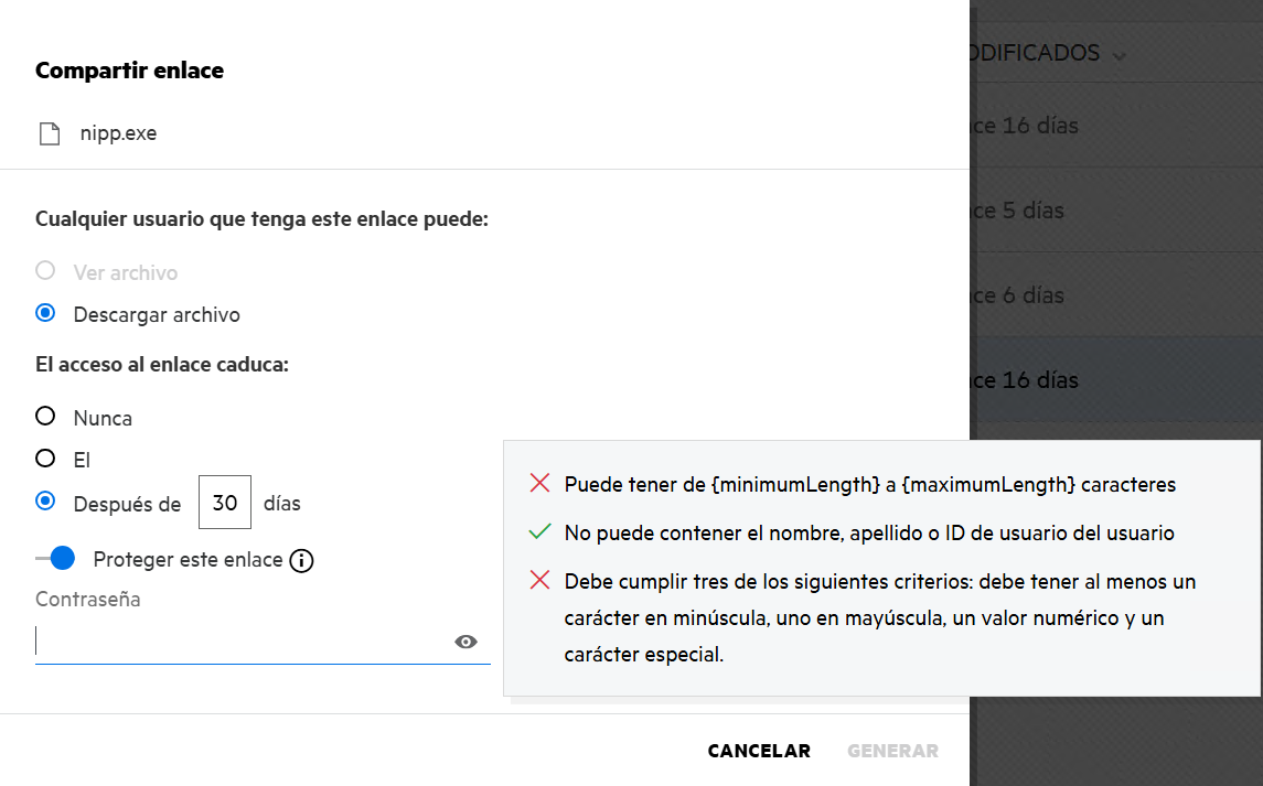 Contraseña: Introduzca la contraseña del enlace para compartir que se generará para el archivo. Si se ha habilitado Aplicar la directiva de contraseñas de Filr al establecer contraseñas para los enlaces para compartir en la consola del administrador, la contraseña definida deberá ajustarse a la directiva de contraseñas de Filr.
