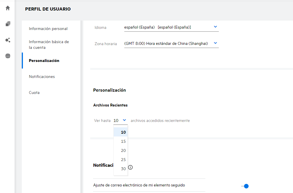 Se puede configurar el número de archivos que aparecerán en la lista Archivos recientes. Para configurar las opciones, acceda al Perfil de usuario.