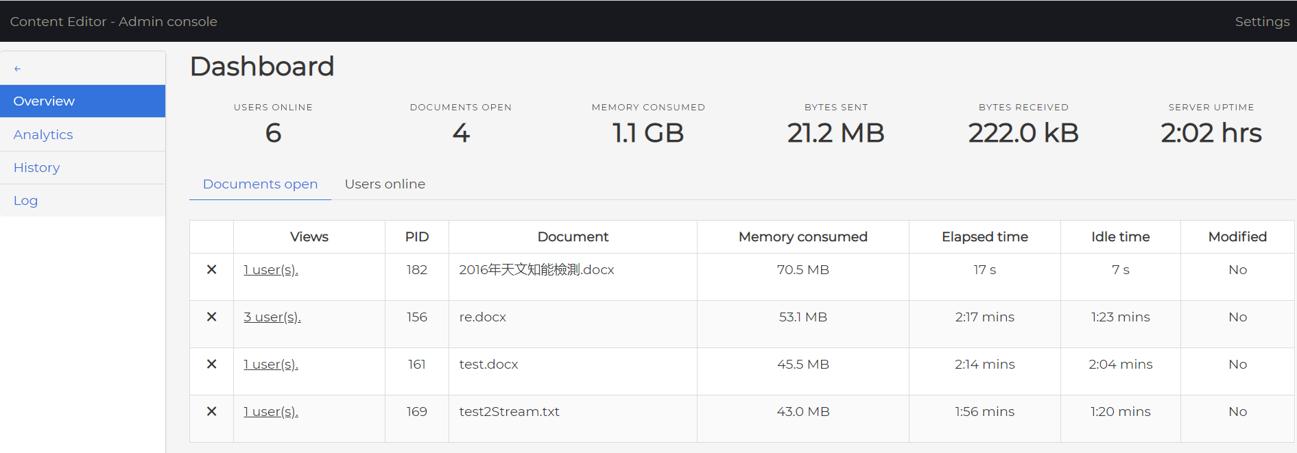 After entering the correct password, you can view the list of live documents opened, total users, memory consumption, document URLs with the number of users viewing that document. You can also end the sessions directly from the panel which results in closing the socket connection to the respective document.