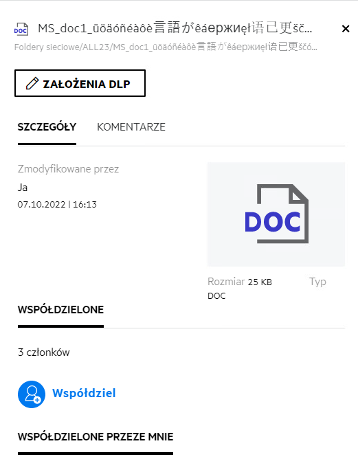 Jeśli DLP jest włączone i polityka jest stosowana na poziomie folderu sieciowego, nazwa polityki DLP pojawi się nad kartą Szczegóły. Nazwa polityki jest tylko do odczytu i nie można jej edytować.