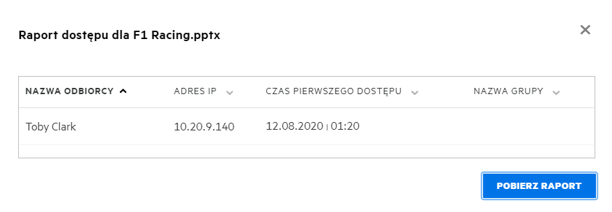 Raport zawiera informacje o dostępie odbiorców, np. kto uzyskał dostęp do pliku, adres IP komputera, za pomocą którego uzyskano dostęp do pliku, oraz datę i godzinę dostępu do pliku. Raport można pobrać w wersji PDF, klikając opcję Pobierz raport.