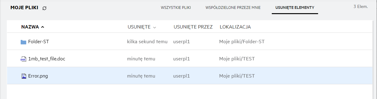 Nazwa: Nazwa plików lub folderów przechowywanych w obszarze Elementy usunięte.