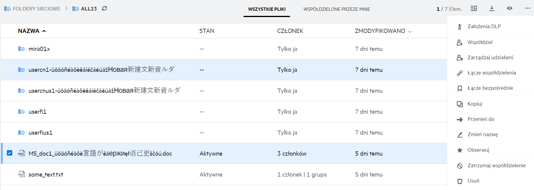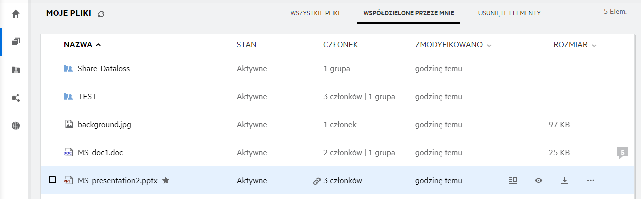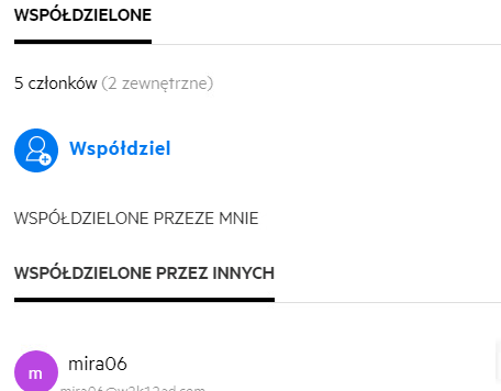 Po współdzieleniu pliku kolumna Członkowie w obszarze Moje plikijest uaktualniania liczbą członków lub grup, z którymi plik jest współdzielony. Wszystkie pliki, które współdzielisz, są też wymienione na liście WSPÓŁDZIELONE PRZEZE MNIE w odpowiednich obszarach. Jeśli ktoś współdzieli z Tobą pliki, są one wymienione w obszarze WSPÓŁDZIELONE ZE MNĄ. Możesz też kliknąć przycisk