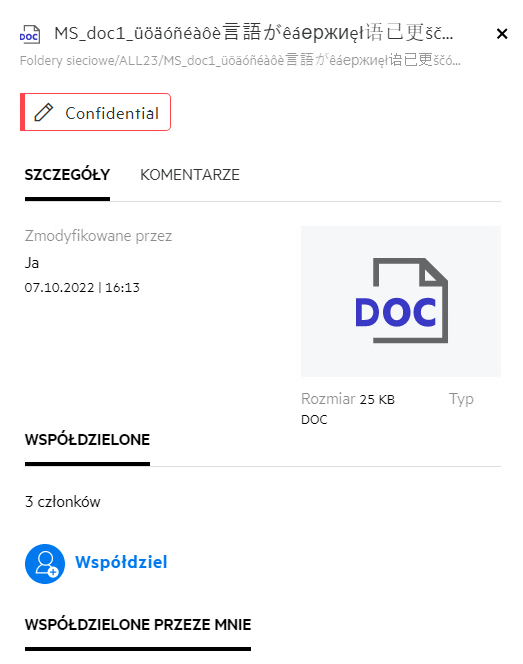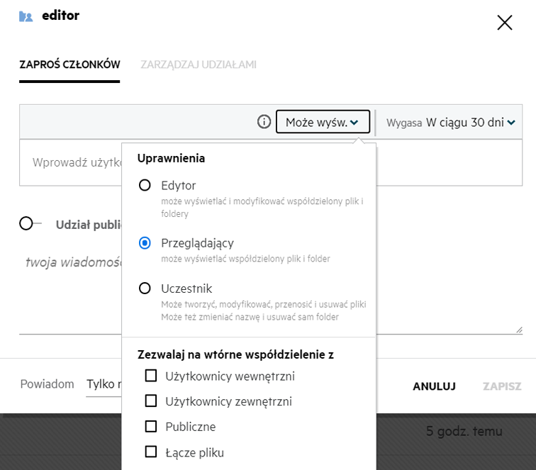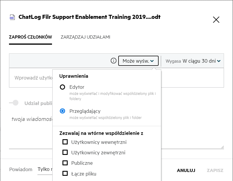 Użytkownicy zewnętrzni: Plik można współdzielić wtórnie z użytkownikami zewnętrznymi.