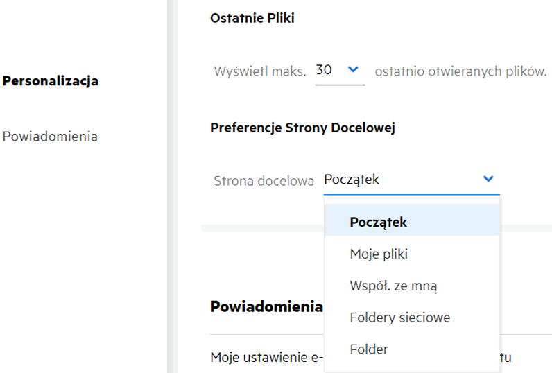 Domyślną stroną docelową jest strona domowa (Początek) i można ją dostosowywać. Jako stronę docelową można ustawić obszary robocze systemu Filr (poza obszarem publicznym) lub folder znajdujący się w obszarach roboczych. Po konfiguracji zalogowanie się do systemu Filr spowoduje otwarcie folderu lub obszaru roboczego ustawionego jako domyślna strona docelowa. Wykonaj następujące czynności, aby ustawić preferencje strony docelowej: