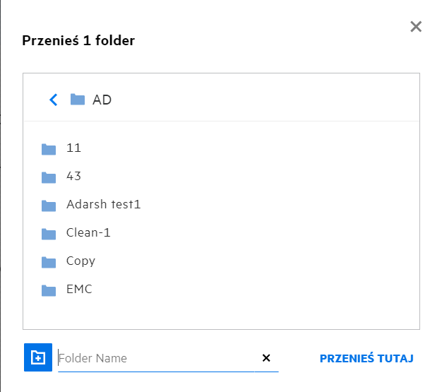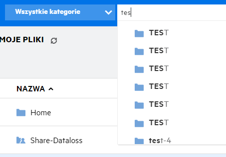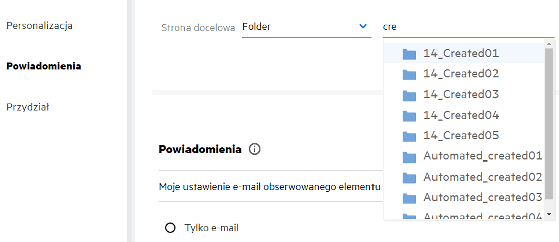 Wybranie opcji Folder powoduje wyświetlenie pola Przeszukaj foldery. Wprowadź nazwę folderu lub trzy pierwsze litery nazwy folderu. Wszystkie foldery o nazwie pasującej do wprowadzonego łańcucha w polu wyszukiwania zostaną wyświetlone na liście do wyboru. Lista zawiera foldery ze wszystkich obszarów roboczych systemu Filr, do których masz dostęp (Moje pliki, Współdzielone ze mną i Foldery sieciowe). Najedź wskaźnikiem na nazwę folderu, aby sprawdzić dokładną ścieżkę folderu.