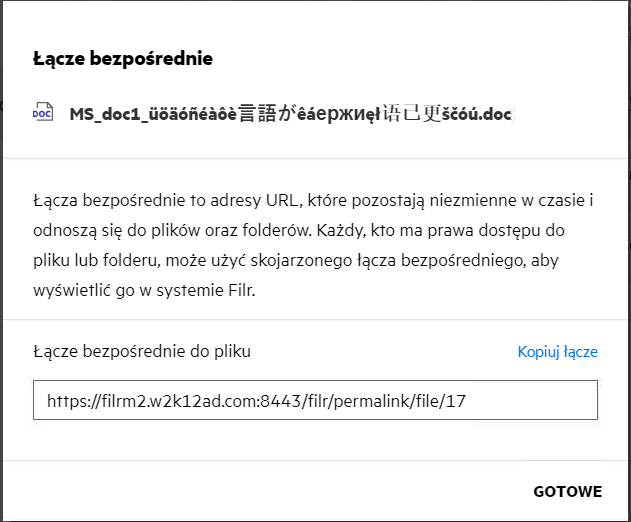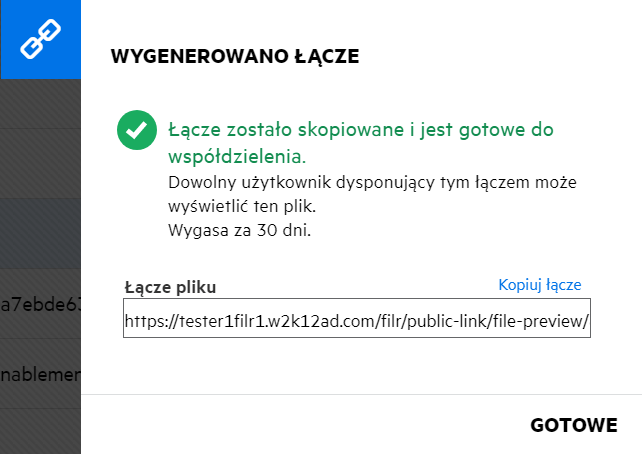 Łącze zostanie wygenerowane i automatycznie skopiowane do schowka. Teraz możesz udostępnić łącze bezpośrednio wybranej osobie, używając poczty e-mail, wiadomości SMS, mediów społecznościowych lub innych metod współpracy. Każdy użytkownik, który kliknie łącze, uzyska bezpośredni dostęp do pliku. W zależności od typu łącza użytkownicy będą mogli wyświetlić lub pobrać plik.