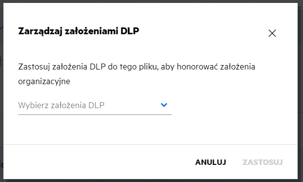 Jeśli DLP jest włączone, a polityka nie jest stosowana na poziomie folderu sieciowego, nad kartą Szczegóły pojawi się przycisk Polityki DLP. Możesz kliknąć ten przycisk, wybrać politykę i zastosować ją do pliku.