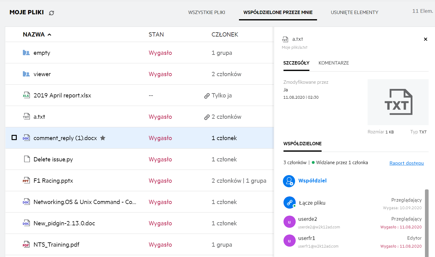 Wyświetlane są szczegóły użytkowników i grup wraz ze statusem wygasania udziału.