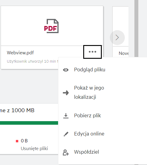 Pobranie pliku — Użytkownik może pobrać plik/folder. Wszystkie pliki multimedialne obsługiwane przez przeglądarkę są renderowane w przeglądarce. Można wówczas pobrać plik. Jeśli typ pliku nie jest obsługiwany przez przeglądarkę, plik zostaje pobrany automatycznie. Każdy plik PDF, którego rozmiar jest większy lub równy 32 MB, zostaje pobrany. Możesz również pobierać pliki za pomocą narzędzi wiersza poleceń, takich jak wget i curl.