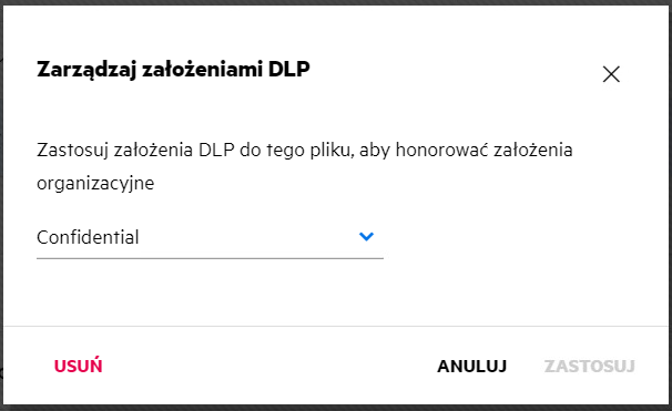 Gdy DLP jest włączone dla folderu sieciowego i polityka nie jest stosowana na poziomie folderu sieciowego oraz gdy zostaniesz Moderatorem dla folderu sieciowego, możesz zastosować lub usunąć politykę DLP do plików w obszarze roboczym.