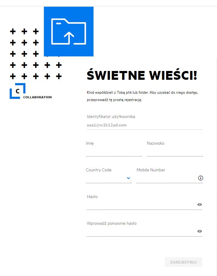 Gdy plik jest współdzielony z użytkownikiem zewnętrznym, użytkownik musi zalogować się do aplikacji Filr, aby uzyskać dostęp do pliku. Po udostępnieniu pliku do użytkownika zewnętrznego wysyłana jest wiadomość e-mail z linkiem do formularza autorejestracji. Użytkownik musi zarejestrować dane w formularzu i zakończyć proces autorejestracji, aby móc zalogować się do aplikacji Filr. Formularz wygląda jak na rysunku poniżej: