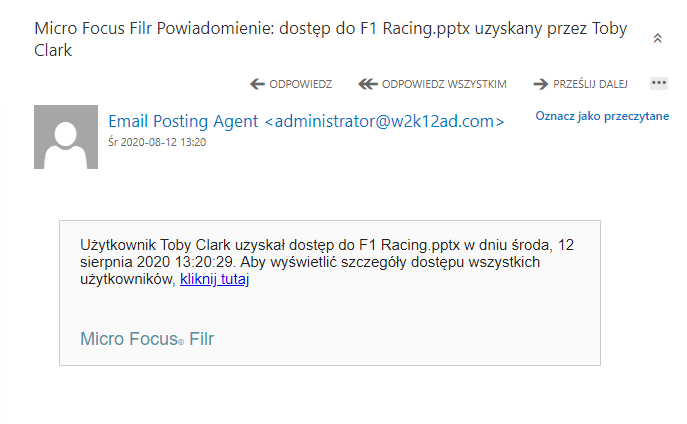 Raport dostępu do udziału zawiera szczegółowe informacje o pliku, na przykład kto i kiedy uzyskał dostęp do pliku oraz czy do pliku zostały dodane komentarze. Raport dostępu do udziału jest dostępny tylko w wersji Filr Advanced. Gdy odbiorca uzyska dostęp do współdzielonego pliku, otrzymasz powiadomienie e-mail z systemu Filr. Raport dostępu możesz też wyświetlić, klikając łącze podane w wiadomości e-mail, które przekieruje Cię do szczegółów odbiorcy. Jeśli odbiorca uzyska dostęp do współdzielonego pliku, w menu Więcej czynności pojawi się opcja Raport dostępu do udziału.