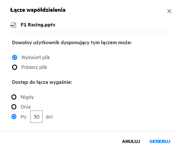 Wybierz typ łącza, które chcesz wygenerować, i wprowadź ustawienia wygasania dla łącza. Kliknij opcję Generuj.