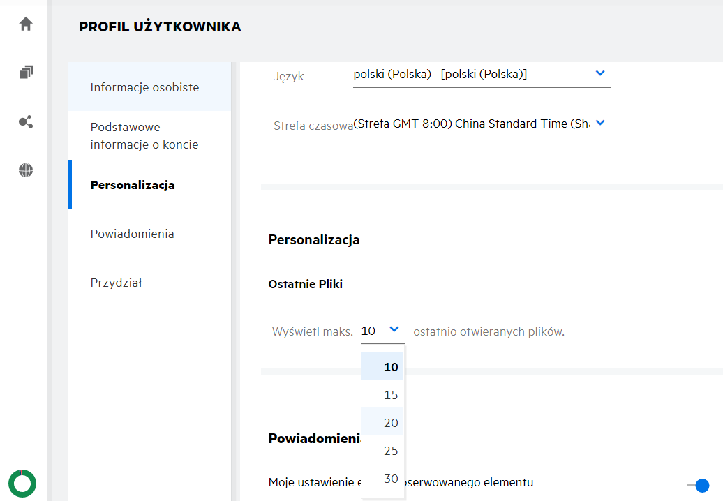 Liczbę plików wyświetlanych na liście Ostatnie pliki można konfigurować. Aby skonfigurować ustawienia, przejdź do swojego profilu użytkownika.