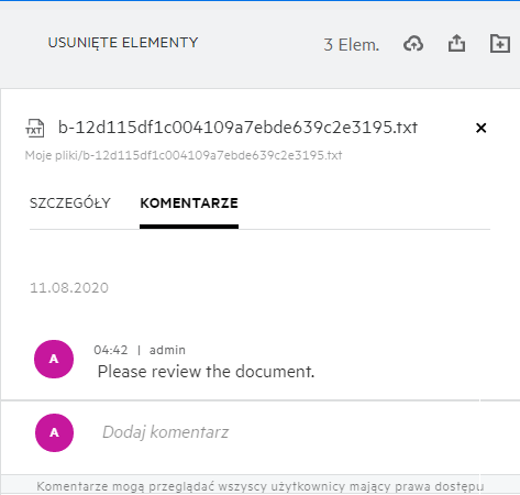Zawiera listę plików i folderów, które zostały przez Ciebie usunięte. System Filr umożliwia odzyskiwanie plików i folderów z kosza oraz przywracanie ich do poprzedniej lokalizacji. Przywrócenie pliku powoduje także przywrócenie wszystkich skojarzonych z nim komentarzy.