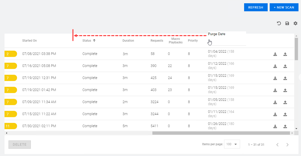Note: You cannot move the column of check boxes or columns containing icons, such as the download (