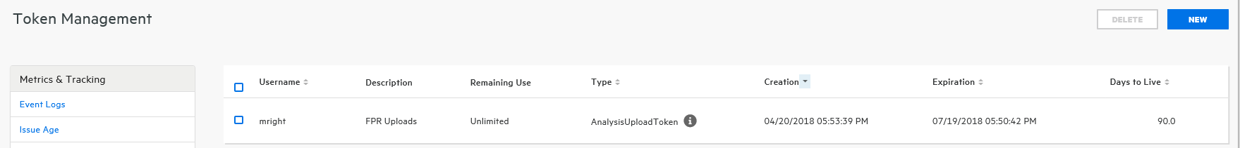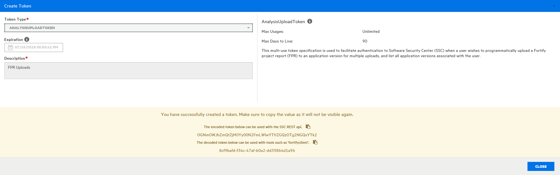 Unique keys that enable users to automate actions within Fortify Software Security Center without using passwords. The user requests a token, authenticates to the Fortify Software Security Center server, and receives back a string that is permissioned for a small set of time-limited actions. Fortify Scan Analytics also generates authentication tokens that are required to configure a connection between Scan Analytics and Fortify Software Security Center. from the Fortify Software Security Center user interface: