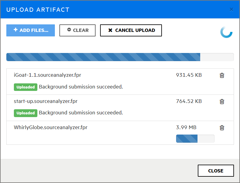 Formats supported for artifact upload are FPR, XML, and, for third-party artifacts, ZIP.